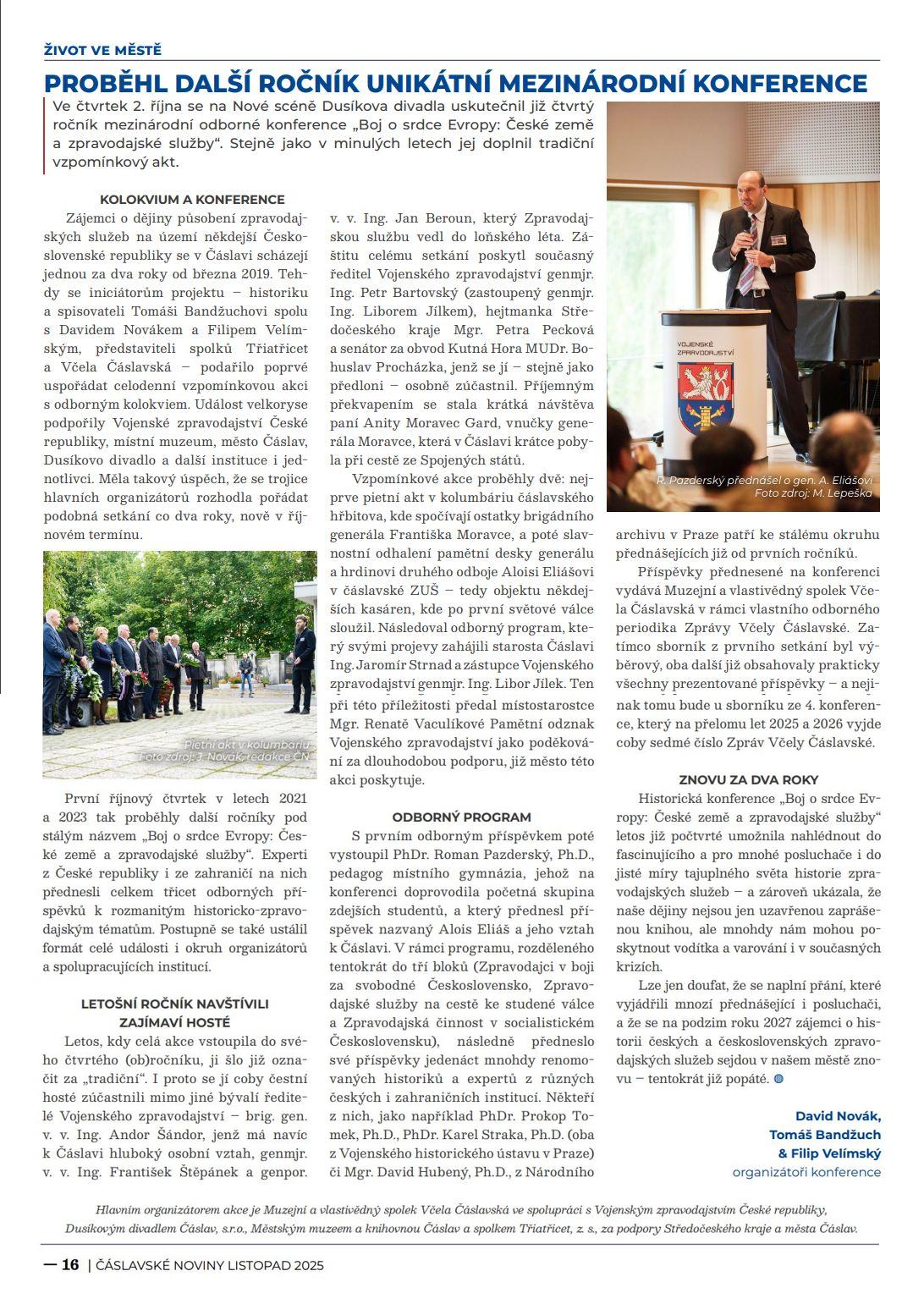01.11.2025 20:30Ve čtvrtek 2. října se na Nové scéně Dusíkova divadla uskutečnil již čtvrtý ročník mezinárodní odborné konference „Boj o srdce Evropy: České země a zpravodajské služby“. Stejně jako v minulých letech jej doplnil tradiční vzpomínkový akt.
